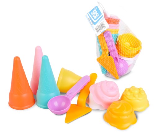 Komplet 4 foremek w kształcie lodów rożków z 4 różnymi wieczkami oraz z łyżką i łopatką do nakładania piasku to idealny zestaw do zabawy w piaskownicy czy na plaży.