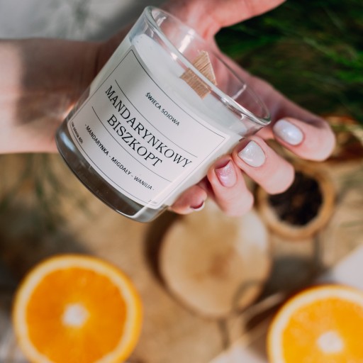 Świeca sojowa o zapachu biszkoptu połączonego ze słodkimi mandarynkami, która przypadnie do gustu każdemu miłośnikowi deserów.