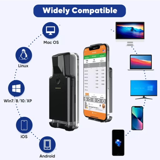 Skaner jest przeznaczony do przypinania z tyłu telefonu, łączność odbywa się przez Bluetooh. Dzięki 3 przyciskom skanowania, możesz wybrać ten najwygodniejszy. Skanera można używać w połączeniu z telefonem, tabletem lub komputerem stacjonarnym.