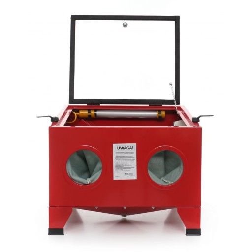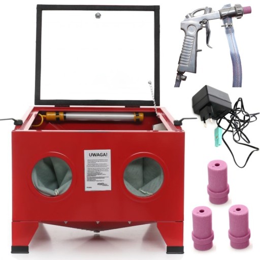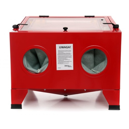 Fabrycznie nowa piaskarka kabinowa o pojemności 90l wyposażona w pistolet do piaskowania oraz lampę podświetlającą.