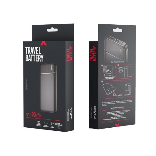Power bank marki Maxlife o pojemności 10000 mAah. Wyposażony jest w dwa wyjścia USB, dzięki czemu można ładować nim kilka urządzeń jednocześnie. Wysokiej jakości nowoczesne ogniwa Li-Poly zapewnią wiele cykli ładowania. Zewnętrzna obudowa wykonana jest z plastiku, wyróżnia się nowoczesnym designem. Posiada dwa gniazda do ładowania: MicroUSB oraz USB-C. Kabel MicroUSB w zestawie.