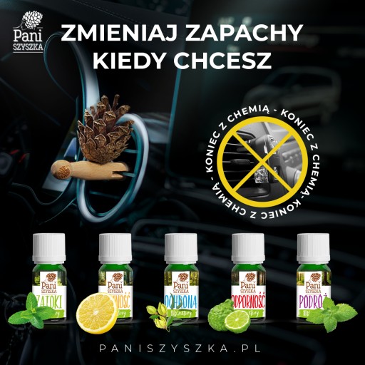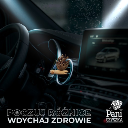 Pani Szyszka to naturalny samochodowy nośnik zapachu oraz specjalnie skomponowane efektywne mieszanki do aromaterapii dla kierowcy i pasażerów. Zapewnia wsparcie w profilaktyce zachorowań układu oddechowego, niezbędne szczególnie w sezonie grypowym. Pani Szyszka to również wsparcie dla systemu immunologicznego – bez dodatków, zanieczyszczeń, rozcieńczania. Dodatkowo wydziela w Twoim samochodzie piękny zapach, prosto z natury!