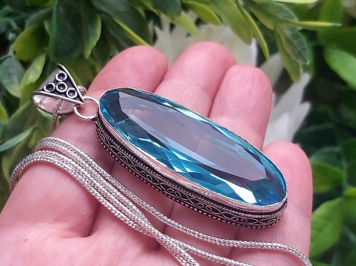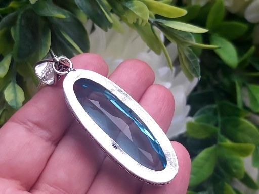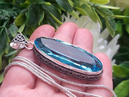 Zrobiono z indyjskiego srebra(ze stopu srebra i miedzi).Centrum wisiorka zdobi oprawiony Niebieski Kwarc. Ręczne wykonanie indyjskiego jubilera. Nowy bez metki.