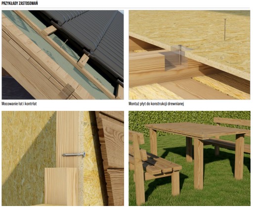 - Wkręty należy wkręcać bezpośrednio do podłoża drewnianego bez wcześniejszego wywiercenia otworów.