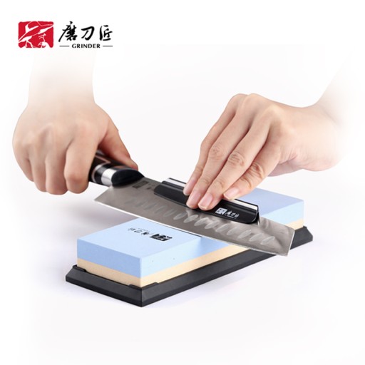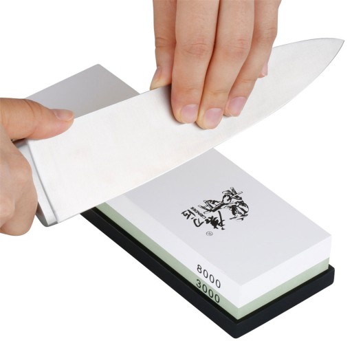By naostrzyć nóż, przesuń po kamieniu (lekko dociskając) kilkukrotnie najpierw jedną, potem drugą stronę noża. Ostrząc nóż staraj się zachować odpowiedni kąt pochylenia noża (15°-30°)