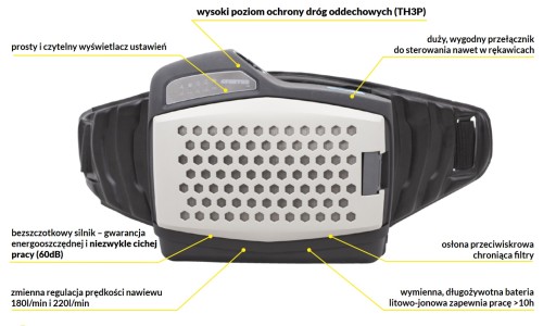 Nawiew SPARTUS® Pro jest gwarancją dostarczenia czystego i suchego powietrza spawaczowi w warunkach szczególnie trudnych o dużym zapyleniu i wilgotności. Wysoki poziom ochrony dróg oddechowych TH3P zapewnia zestaw wymiennych filtrów (główny HEPA, wstępny z węglem aktywnym) Całość zabezpieczona jest osłoną przeciwiskrową. Nawiew umożliwia zmienną regulację prędkości nadmuchu 180l/min oraz 220l/min. Wszelkie problemy z przepływem sygnalizowane są przez wibracyjno-akustyczny system alarmowy. Wąż oddechowy połączony jest z obudową przyłbicy. Zapewnia to komfort i wygodę w poruszaniu się podczas pracy.