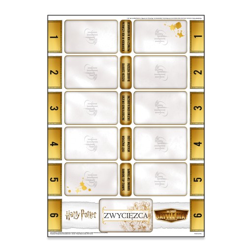 Top Trumps Battle Mat Harry PotterKto zatriumfuje w Battle Mat? Top Trumps Battle Mat to nowy model rozgrywki popularnej gry Top Trumps, w wydaniu z planszą. Bohaterami tej edycji startegicznej gry karcianej jest 30 wspaniałych czarownic i czarodziejów ze świata magii J.K. Rowling. W tej ostatecznej magicznej bitwie zmierzą się ze sobą najpotężniejsi czarodzieje z serii o Harry Potterze, a konkurować będą w kategoriach takich jak długość różdżki, pierwszy rok w Hogwarcie czy wskaźnik lęku. Walcz na cechy, zbierz wszystkie karty i wygraj!Graj swoją ulubioną postacią z gry karcianej TOP TRUMPS Harry Potter 30 czarodziejów i czarownic.Rzucaj czary z rozwagą i zaskocz swoich przeciwników! Pierwszy gracz, który wygra siedem walk, wygrywa! ...ale uważaj na twist - dogrywkę dogrywki!Top Trumps Battle Mat Harry PotterGraj w Top Trumps Battle Mat zawsze i wszędzie, z dowolną liczbą osób. Przygotuj się do przechytrzenia swoich przeciwników, odkryj nowe ekscytujące fakty o świecie Harrego Pottera, stań do bitwy i wygraj!Walczcie, używając swoich kart TOP TRUMPSRzucajcie czary z rozwagąPierwszy gracz, który wygra siedem walk, wygrywa!Zawartość gry Top Trumps Battle Mat Harry PotterTop Trumps Battle Mat1 talia Top Trumps Harry Potter 30 Czarodziejów i Czarownic5 żetonów czarówinstrukcjaSpecyfikacjaIlość graczy: minimum 2Wiek: 6+Czas gry: 30 minutJęzyk wydania: polskiZasady gry Top Trumps Battle Mat Harry PotterBATTLE MAT ułóżcie na środku miejsca rozgrywki.Każdy gracz wyciąga jedną losową kartę i sprawdza jej wartość TOP TRUMPS.Gracz z kartą o najwyższej wartości rozpoczyna grę. W przypadku remisu gracze losują kolejne karty, póki jeden z graczy nie wygra.Włóżcie karty z powrotem do talii. Potasujcie karty i rozdajcie każdemu graczowi po trzy, awersem do dołu. Sprawdźcie swoje karty, nie ujawniając ich zawartości.Potasujcie 5 żetonów czarów, nie ujawniając ich zawartości. Niech każdy weźmie dwa żetony czarów. Sprawdźcie swoje karty, nie ujawniając ich zawartości.• Każdego czaru można użyć tylko raz podczas danej rozgrywki, więc czarujcie • Działanie czarów jest wyjaśnione w instrukcji.Jeśli chcesz, możesz teraz rzucić jeden czar. Odłóż żeton czaru po jego użyciu.Pierwszy gracz: Wybierz jedną kartę i połóż ją awersem do dołu na jednej z pięciu kategorii na BATTLE MAT.Drugi gracz: Wybierz jedną kartę i połóż ją awersem do dołu na tej samej kategorii.Drugą kartę ułóż tak samo, ale tym razem zaczyna drugi gracz. Wybierz nową kategorię.Trzecią kartę ułóż tak samo, ale tym razem zaczyna trzeci gracz. Znowu wybierz nową kategorię.Odsłońcie swoje karty w tej samej kolejności, w której zostały ułożone.Karta z najlepszym wynikiem w danej kategorii wygrywa.Jeśli wygrasz, połóż karty na Polu 1 na macie.Uwaga: W przypadku remisu (lub braku wartości danej kategorii) odłóżcie karty na bok, a zwycięzca następnej rundy wygrywa obie walki!Na końcu każdej walki połóżcie karty na kolejnych polach wyników, by pokazać, ile wygranych udało Wam się zdobyć.Grajcie do momentu, aż jeden z graczy wygra siedem walk, chyba że każdy z graczy ma na swoim koncie sześć zwycięstw, wtedy czas na dogrywkę!