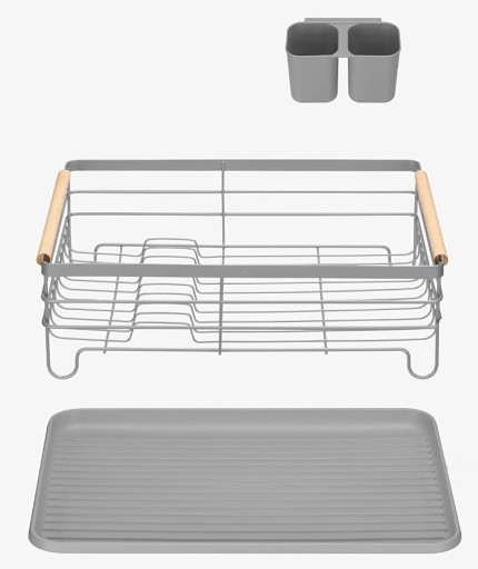 СЕРАЯ СУШИЛКА ДЛЯ СУШКИ ПОСУДЫ С ДЕРЕВЯННЫМИ РУЧКАМИ, СТОЯЩАЯ СЕРАЯ КАПЕЛЬНИЦА