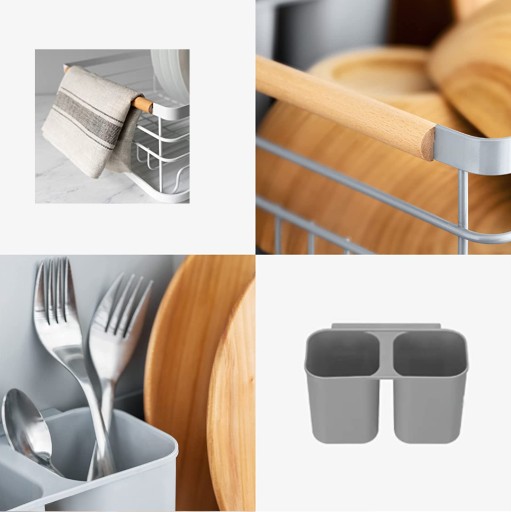✅Suszarka do naczyń cechuje wysoka jakość a także trwała i metalowa konstrukcja. Tacka wykonana z żywicy zabezpiecza blat przed zamoczeniem. Zestaw zawiera również plastikowy, dwukomorowy ociekacz na sztućce. Metalowa szara suszarka z drewnianymi uchwytami pasuje do każdej kuchni.