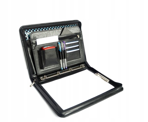 Teczka posiada dużo kieszonek przegród, cztery wewnętrzne duże kieszenie w tym jedna na zamek błyskawiczny , miejsce na pieczątkę, laptop, tablet, telefon, długopisy , wizytówki, dowód rejestracyjny, kartę kierowcy,karty paliwowe itp. W teczce mieści się laptop o szerokości do 34,5 cm i długości do 23,5 cm.