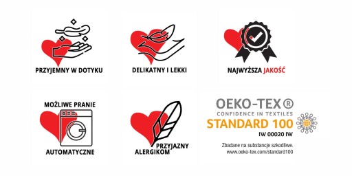 ✅ Produkt posiada certyfikat OEKO-TEX® STANDARD 100, który potwierdza jej wysoką jakość. To właśnie on gwarantuje, że produkt jest wolny od substancji, które mogłyby mieć negatywny wpływ na zdrowie człowieka w tym: pestycydów, chlorofenoli, formaldehydu, barwników alergizujących, czy nawet metali ciężkich.