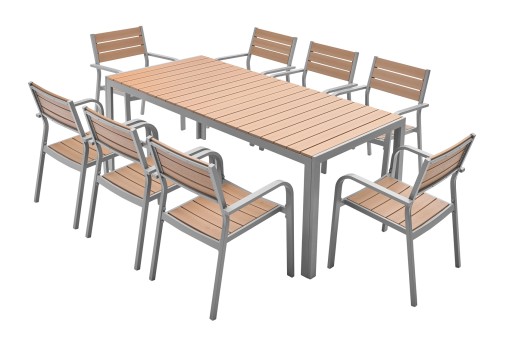 Konstrukcję stołu stanowi wysokiej jakości aluminium, malowane metodą proszkową. W oferowanym zestawie blat stołu wykonany jest z nieabsorbujących wody desek kompozytowych WPC.