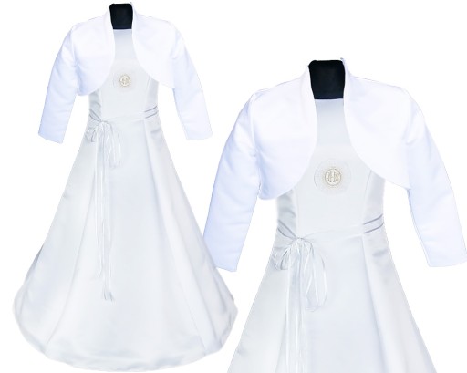 - Zdobienia - Szyfonowo- satynowa tasiemka przepasająca- (możliwość zawiązania kokardki z tyłu lub z przodu) lub na życzenie doszyta na stałe. Emblemat IHS (w standardzie srebrny lub inny wybrany przy zakupie) .