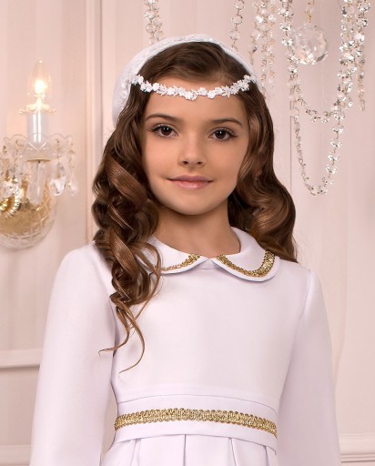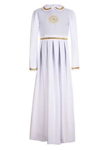 Alba komunijna z zakładkami w talii. Długi rękaw w kształcie dzwonka, kołnierzyk, pasek i rękawy ozdobione są złotą taśmą.