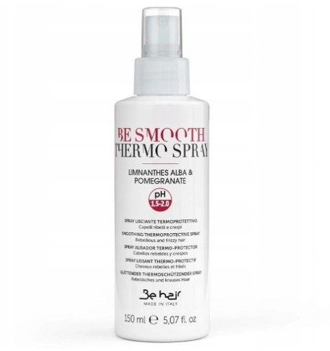 Be Hair Be Smooth Thermo Spray to spray wygładzający do włosów niesfornych i puszących się. Dodatek oleju z nasion łąkowej piany i ekstraktu z granatu sprawia, że lotion ma działanie dyscyplinujące i odżywiające. Produkt wygładza i dyscyplinuje pasma, a ponadto zostawia miękkie i lśniące. Ekstrakt z granatu wzmacnia włosy osłabione oraz z tendencją do wypadania intensywnie je regenerując. Olej z nasion łąkowej piany bogaty w antyoksydanty sprawdzi się w przypadku włosów suchych z rozdwojonymi końcówkami, intensywnie je nawilżając i odżywiając. Spray termoochronny ma działanie antystatyczne, dzięki czemu zapobiega puszeniu i elektryzowaniu włosów, a dodatkowo ułatwia rozczesywanie pasm.