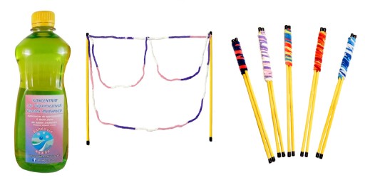 + kijki do puszczania gigantycznych baniek mydlanych wersja oczy ,kijki w nowej wersji wykonane z PCV oraz kolorowych sznurków które są jeszcze bardziej chłonne od sznurków z bawełny, dzięki temu wypuścisz jeszcze więcej Gigantycznych baniek mydlanych