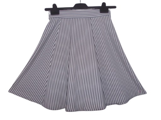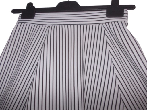 Przedmiotem sprzedaży jest rozkloszowana mini spódniczka , biała w czarne paski , marki ANNA FIELD. Zapięcie z tyłu na zamek . Bez podszewki.