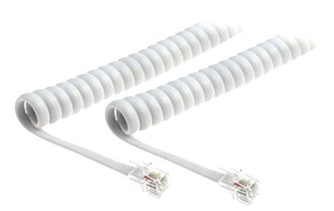 Wysokiej jakości Spiralny przewód telefoniczny w kolorze białym zakończony fabrycznie wtykami 4P4C.