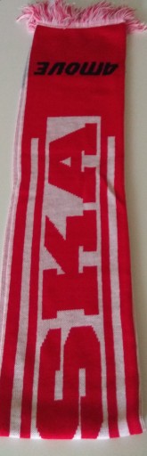 Z jednej strony szalika napis "Polska" czerwonymi literami na białym tle.