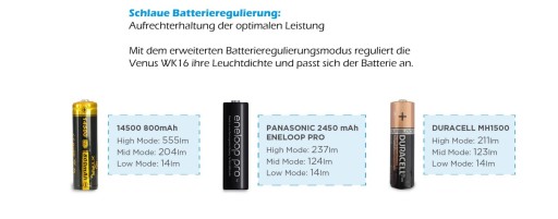 Latarka może być zasilana zwykłymi bateriami AA, akumulatorkami Ni-MH 1,2V AA oraz akumulatorkami Li-ion 3,6V-3,7V AA