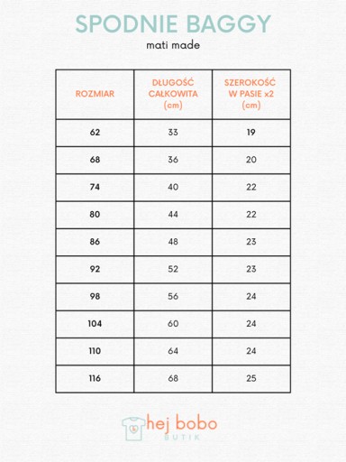 Każdy produkt jest ręcznie szyty, więc wymiary mogą różnić się od podanych w tabeli +/- 2 cm. Prezentowane zdjęcia mają charakter podglądowy.