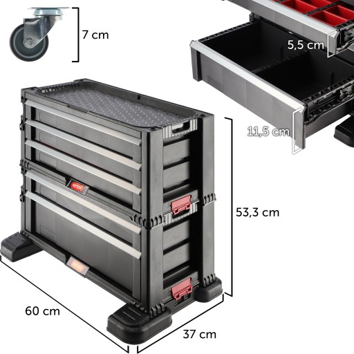 Funkcjonalne przegródki i pojemniki z mocnego plastiku umożliwią Ci zachowanie porządku i błyskawiczny dostęp do rzeczy, których potrzebujesz. Krótko mówiąc, będziesz miał wszystko pod ręką, unikniesz bałaganu, a praca i majsterkowanie pójdą ci sprawniej.