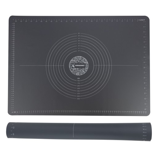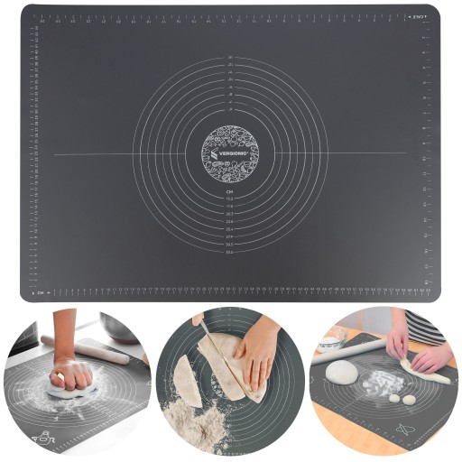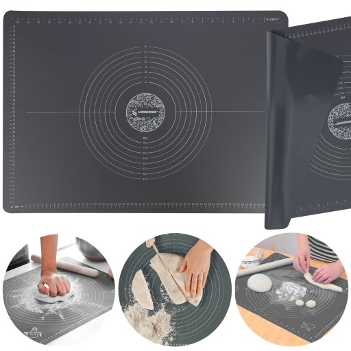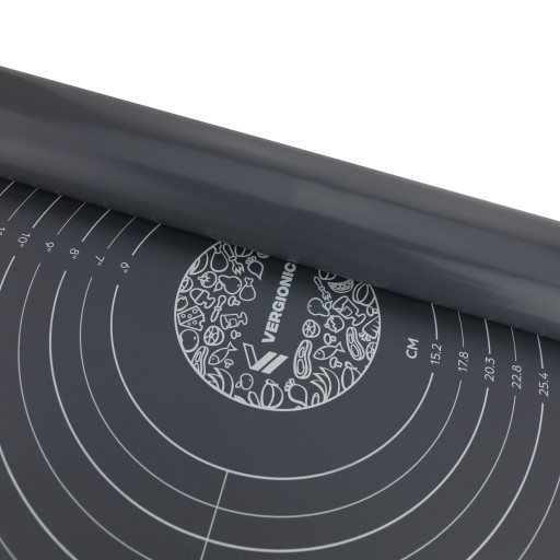Mata jest wykonana z wysokiej jakości silikonu, który doskonale trzyma się podłoża a stolnica się nie przesuwa. Gładka powierzchnia maty sprawia, że ciasto nie przywiera. Nadaje się do mycia w zmywarce. Wymiary produktu to 50 x 70 cm. Stolnica posiada zaznaczone specjalne, okrągłe formy ułatwiające przygotowania odpowiedniego rozmiaru wypieku np. pizzy, o średnicy od 15,2 cm/6 cali do 33 cm/13 cali. Na bokach znajdują się dodatkowe miarki – w calach i centymetrach.