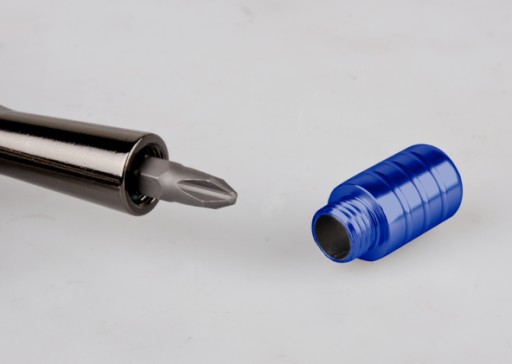 Uchwyt kątowy jest idealnym rozwiązaniem dla wszelkiego rodzaju prac związanych z wkręcaniem i wierceniem w miejscach trudno dostępnych. Narzędzie umożliwia szybką i sprawą pracę oraz wymianę bitów oraz wszelkiego rodzaju wierteł o przekroju sześciokątnym. Korpus uchwytu został wykonany ze stali ocynkowanej, trzpień mocujący uchwyt we wkrętarce wykonano ze chromowo-wanadowej Cr-V natomiast gniazdo pod bity wykonano z aluminium. Przekładnia oraz elementy napędowe (wrzeciono) oparto na łożyskach kulkowych. Uchwyt mocujący został wyposażony w magnes oraz pierścień blokujący, który zapobiega przypadkowemu wyciągnięciu bita z gniazda. Narzędzie zagięte jest pod kątem 90° i wyposażone zostało w dodatkowe ramię stabilizujące, które można ustawić w 24 pozycjach oraz odchylić pod kątem 90° w stosunku do linii narzędzia. Takie rozwiązanie pomaga w dobraniu odpowiedniej pozycji podczas pracy. Dodatkowo w ramieniu stabilizującym znajduje się schowek dla jednej zapasowej końcówki.