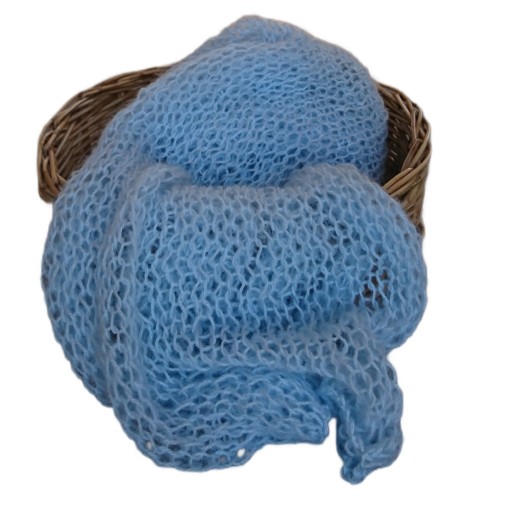 Wykonany ręcznie w naszej pracowni kocyk/owijka do sesji noworodkowych. Owijka wykonana z włoczki angora, w kolorze delikatnego błękitu (baby blue). Kocyk wykonany dość luźnym splotem, dzięki czemu daje efekt "mgiełki"i jest bardzo elastyczny.