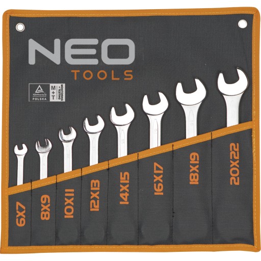 - Klucze płaskie w zestawie: rozmiary: 6 x 7, 8 x 9, 10 x 11, 12 x 13, 14 x 15, 16 x 17, 18 x 19, 20 x 22 mm, tekstylne etui