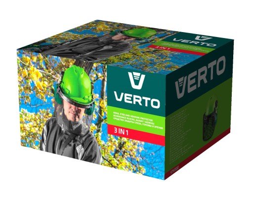 Ochraniacz słuchu, głowy i wzroku 3 w 1 VERTO (nr ref. 97H300) to uniwersalny produkt do zastosowania w pracach z kosą spalinową, pilarką łańcuchową i innych, gdy użytkownik potrzebuje zapewnić sobie kompletną ochronę słuchu, głowy i wzroku. Kask wykonany z wysokiej jakości tworzywa sztucznego ABS wyposażony w regulację obwodu pozwala na dopasowanie rozmiaru. Miękkie wykończenie nauszników zwiększa komfort użytkowania. Osłona twarzy wykonana z metalowej siatki chroni twarz użytkownika przed drobnymi cząsteczkami stałymi. Oznaczenie CE to gwarancja bezpieczeństwa dowodząca, że produkt spełnia wszystkie wymagania unijne.