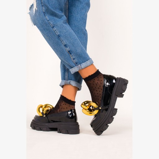 Czarne mokasyny lakierowane półbuty na platformie ze złotym łańcuchem polska skóra Casu 4075