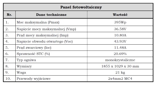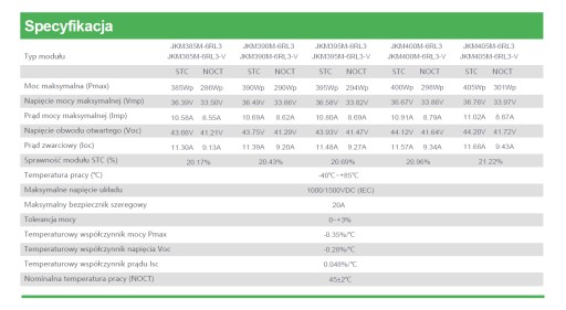 - Moc znamionowa: STC (Pmax) 400Wp / NOCT (Pmax) 298Wp