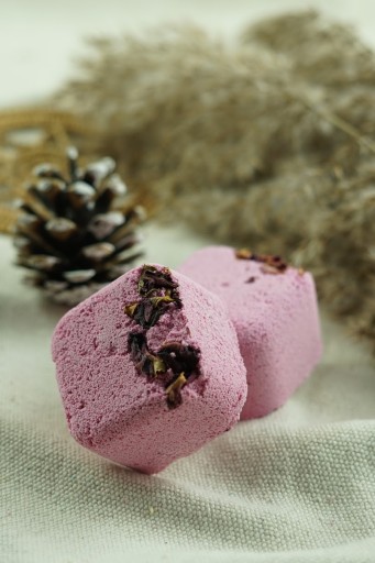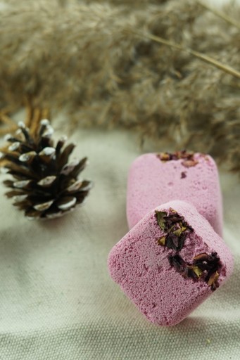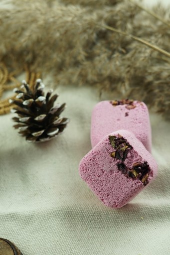 Nasze kostki zawierają dodatek suszonych płatków róży oraz olejki eteryczne, które doskonale odprężą, złagodzą napięcia, ułatwią oddychanie i pomogą się wyciszyć po całym dniu.