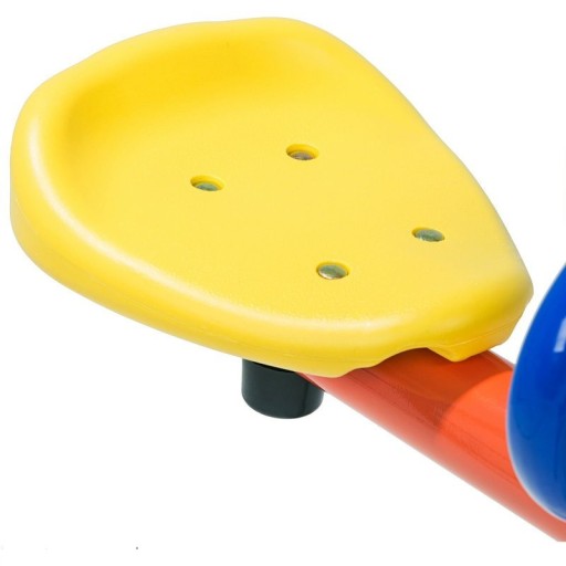 Uchwyty zapewniają bezpieczne podparcie dla dzieci, a stalowa rura zapewnia niezbędną stabilność. Amortyzatory pod siedziskiem zapobiegają silnemu uderzeniu w podłogę. Kołki w zestawie do bezpiecznego mocowania w ziemi.