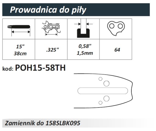 Pasuje do modelu: HGV/Partner: 350, 351, 353, 355, 13, 136, 137, 140, 141, 142, 254, 257, 340, 345, 346, EL1400-1500-1600, 261, 262 ; Jonsered: 2016, 2036, 2040, 2045, 2050 ; Makita/Dolmar: 430, 520, 4300l, 5200l, 460, 500, 4600, 5000, 5030 ; OLEOMAC/EFCO 938, 941, 942, 946, 947, 952, 956, 962 ; SOLO: 639, 641, 644, 645, 650 ; SHINDAIWA 446S452S, 488, 490 ; TOPSUN 4516, 4518, 5016, 5018, 5020 / długość 15 cali / podziałka .325 cala 1,5mm