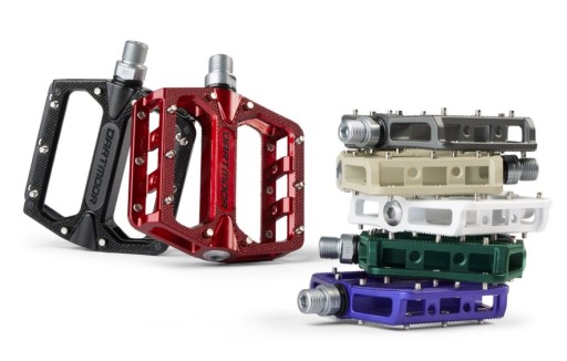 Lekkie pedały platformowe wykonane z odlewanego aluminium. Cechują się bardzo niskim profilem, mocną budową i bardzo dobra przyczepnością. Oś wykonana ze stali Cr-Mo. Wyposażone w uszczelniane łożyska maszynowe i tuleje ślizgow. 10 wymiennych pinów na stronę (6 wymiennych).