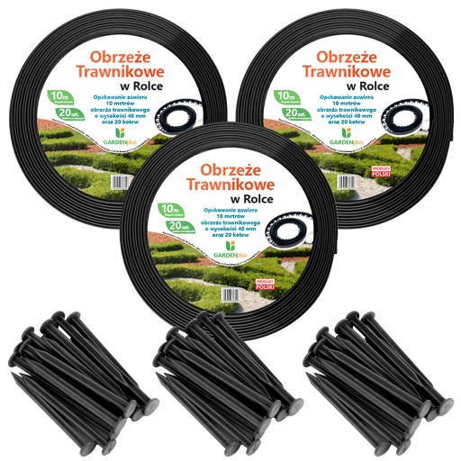W zestawie znajduje się 30mb obrzeża + 60 kołków mocujących