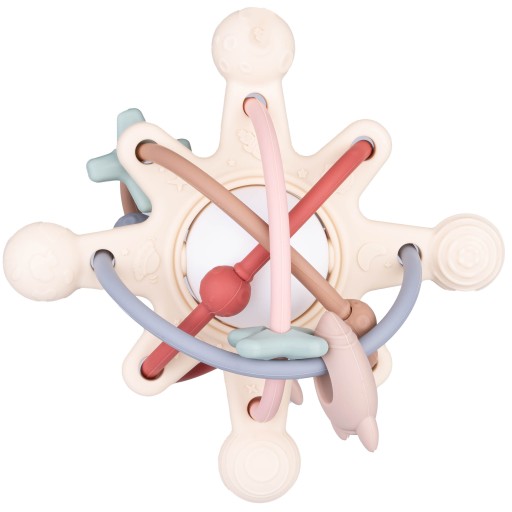 Kosmiczna grzechotka to moc odlotowej zabawy w stylowej odsłonie! Zabawka posiada w swym wnętrzu kuleczkę, która grzechocze przy potrząsaniu. Naokoło niej znajdują się miękkie linki a ruchomymi elementami do przesuwania. Jakby tego było mało, zabawka wyposażona została także w wypustki, przez co sprawdzi się również w roli gryzaka. Jej kształt pasuje idealnie do rączek malucha, co ułatwia najmłodszym chwytanie grzechotki.