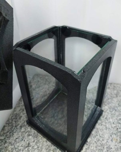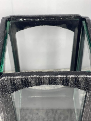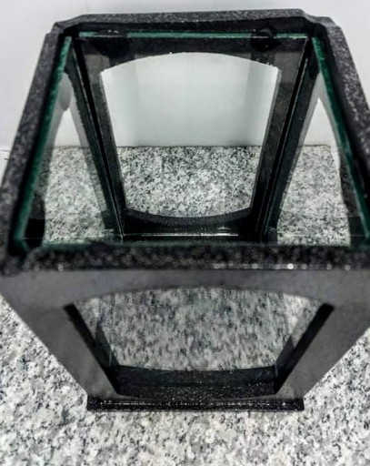 Masywny znicz wykonany z żywicy epoksydowej, znicz w kształcie prostokąta z wklejonymi szybami przezroczystymi. Znicz wykonany estetycznie i solidnie. Znicz jest ciężki waży około 3 kg. Zmieści się w zniczu wkład wysokości około 17 cm.