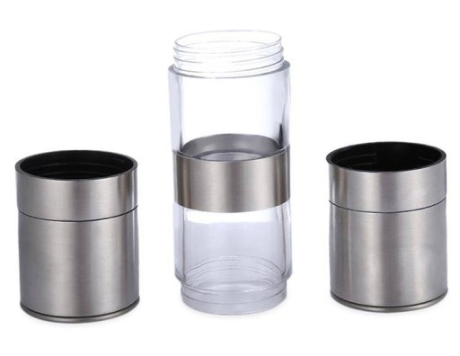 Elegancki wygląd, mechanizmy mielące zakryte aluminium w kolorze satyny, a akrylowe, przezroczyste okienka dają wgląd na zawartość młynka. Posiada 2 komory na ziarenka pieprzu i kryształki soli.