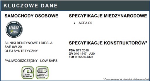 TOTAL QUARTZ INEO XTRA FIRST 0W-20 jest syntetycznym olejem silnikowym, opracowanym i stosowanym do fabrycznego napełniania i posprzedażowego PSA PEUGEOT CITROEN.
