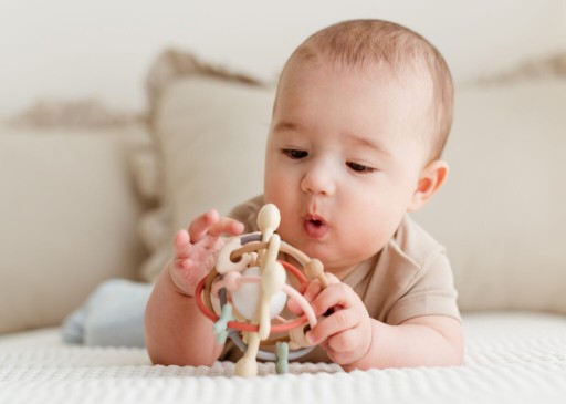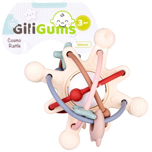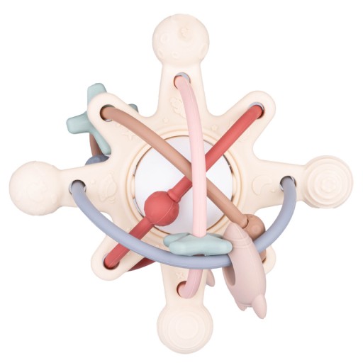 Kosmiczna grzechotka to moc odlotowej zabawy w stylowej odsłonie! Zabawka posiada w swym wnętrzu kuleczkę, która grzechocze przy potrząsaniu. Naokoło niej znajdują się miękkie linki a ruchomymi elementami do przesuwania. Jakby tego było mało, zabawka wyposażona została także w wypustki, przez co sprawdzi się również w roli gryzaka. Jej kształt pasuje idealnie do rączek malucha, co ułatwia najmłodszym chwytanie grzechotki.