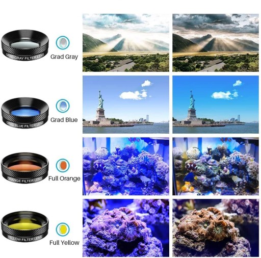 W zestawie znajdziesz też 4 soczewki: pomarańczową, żółtą, niebieską i szarą, które wyeksponują kolory, które chcesz.