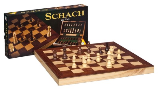 Szachy wykonane z drewna. Wymiar szachownicy 41,5 x 41,5 cm. Wysokość króla 7,5 cm.