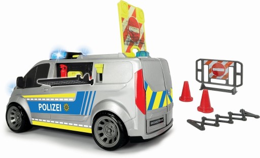 Samochód policyjny marki Ford, bez napędu, wyposażony w światło i dźwięk, sprężynowe dżwi bagażnika, boczny spust opuszczający drzwi, Try Me, 1:18, WERSJA POLSKA, baterie 2 x 1,5 V R6 w zestawie, 28 cm