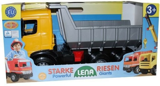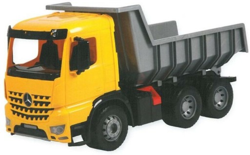 Super wywrotka Mercedes Giants Dump Truck, model AROCS, trójosiowa, z żółtą kabiną, czarnym podwoziem i srebrną naczepą. Wykonana z wysokiej jakości materiałów, spełniających normy Europejskie. Pojazd posiada blokadę naczepy, dzięki czemu dziecko może bezpiecznie na nim siadać. Ta funkcjonalna wywrotka ma 63 cm długości i wytrzymuje obciążenie do 150kg. Zabawka w otwartym opakowaniu kartonowym.