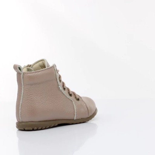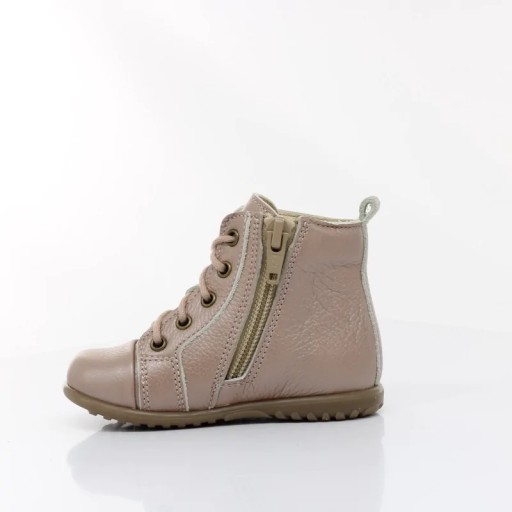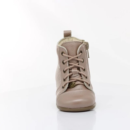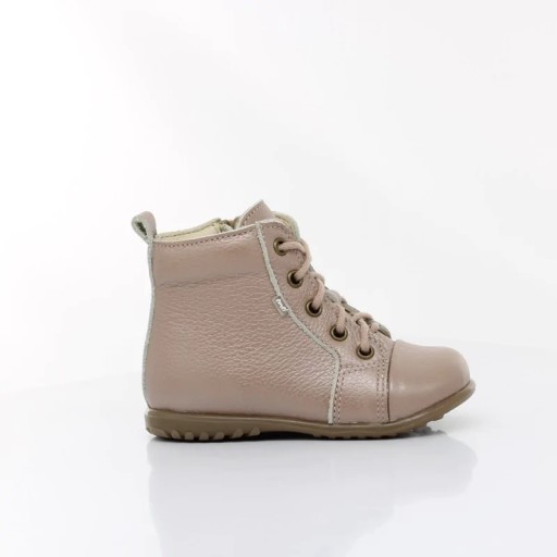 Trzewiki - idealne do nauki chodzenia, wyprodukowane z najwyższej jakości skóry naturalne. Buciki odpowiednio stabilne i elastyczne, wnętrze wyścielone mięciutka skórą, co chroni przed otarciem. Wkładka skórzana profilowana - odpowiednio kształtuje rozwój stopy. Zapięcie regulowane sznurówką oraz zamkiem z boku buta. Posiadają szeroki czubek, co daje swobodę paluszkom. Podeszwa elastyczna oraz antypoślizgowa.