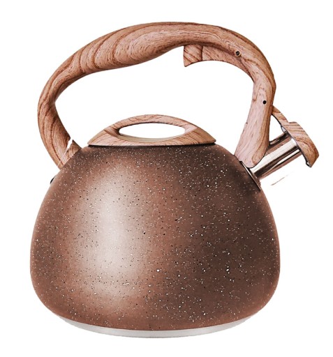Czajnik wykonany ze stali nierdzewnej pokrytej powłoką marmurową w kolorze brązowym.