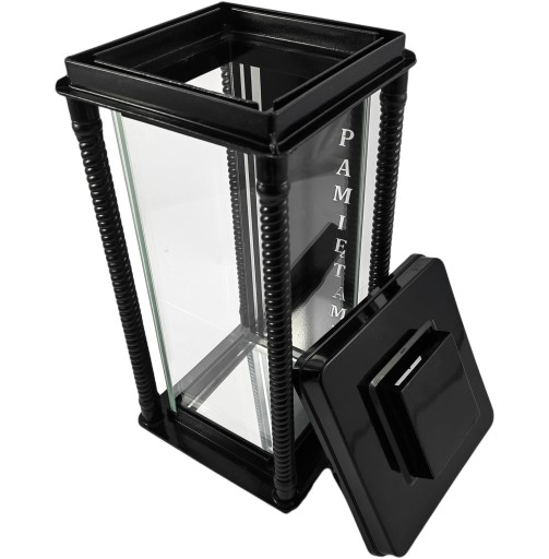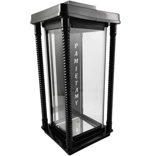 Kapliczka wykonana z grubego i bezbarwnego szkła. Na rogach zamontowane są cztery czarne kolumienki. Znicz jest ciężki, solidny, a szeroka podstawa zapewnia stabilność. Tylna ściana została ozdobiona od wewnątrz srebrnym napisem PAMIĘTAMY.